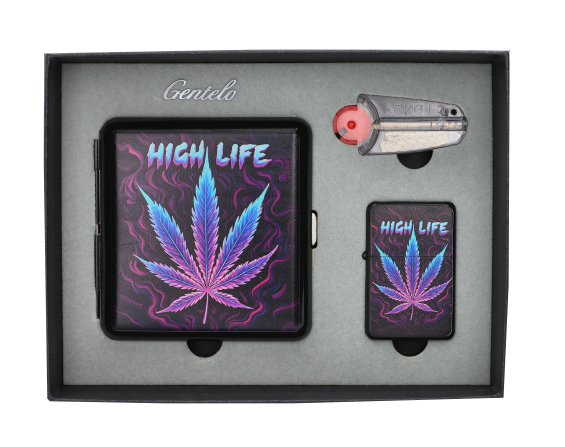 Dárkový set tabatěrky s benzínovým zapalovačem s designem konopného listu je skvělý dárek pro každého kuřáka.