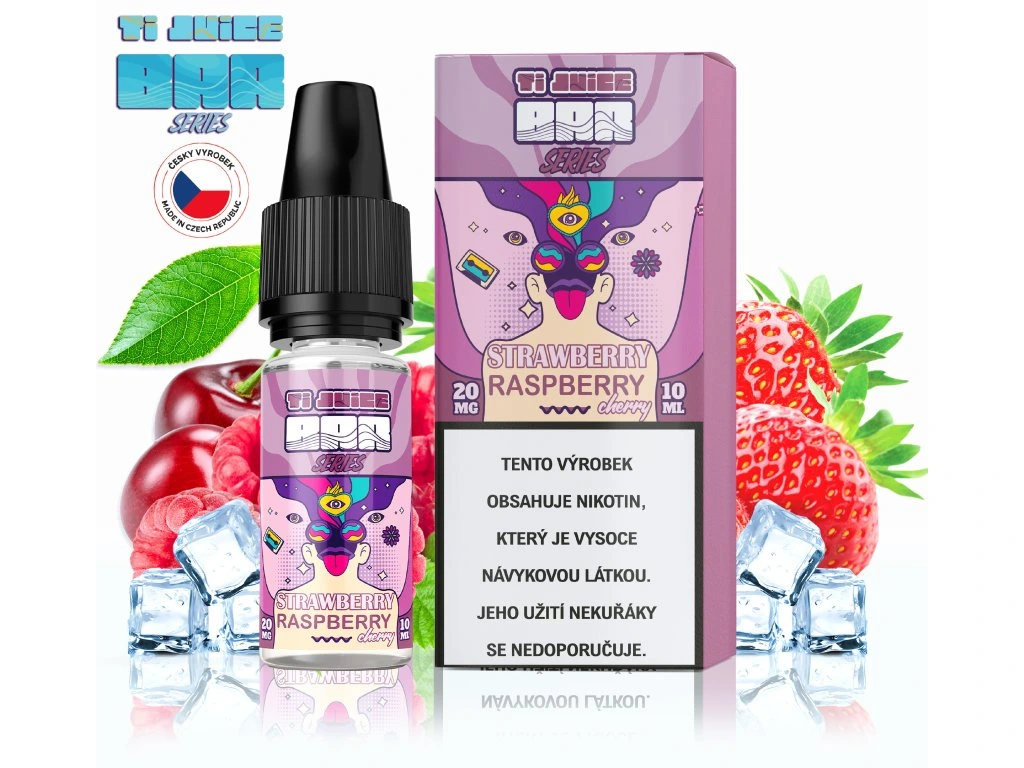 TI Juice Bar Series – Strawberry Raspberry Cherry Nic Salt 20 mg, náplň do cigaret přináší dokonale vyváženou směs tří oblíbených bobulových plodů. Sladkost zralých jahod se snoubí s jemnou kyselostí malin a výraznou chutí šťavnatých třešní, což vytváří osvěžující a plný chuťový zážitek. Díky použití nikotinové soli nabízí hladší hit a rychlejší vstřebání nikotinu, což zajišťuje uspokojivý zážitek bez drsnosti v krku. Tento e-liquid je ideální pro pod systémy a MTL zařízení, poskytuje vyvážený poměr 50 % PG a 50 % VG pro optimální chuť a tvorbu páry.